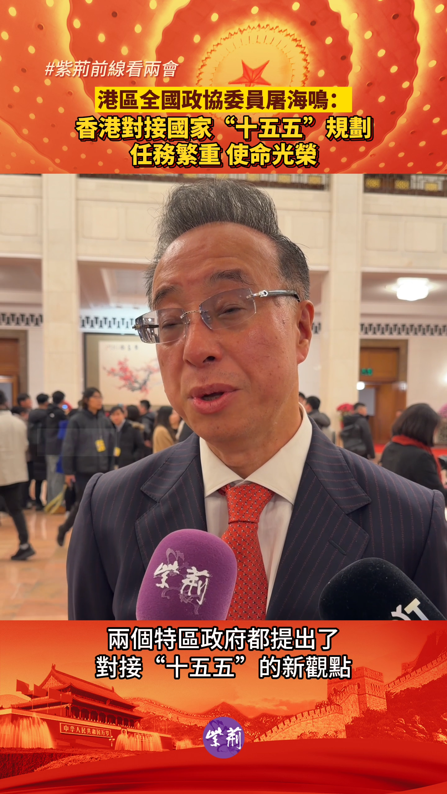 港区全国政协委员屠海鸣在接受紫荆杂志记者采访时表示,香港对接国家“十五五”规划任务繁重,使命光荣,一定不能辜负中央的期望,不能辜负全国人民的期望。