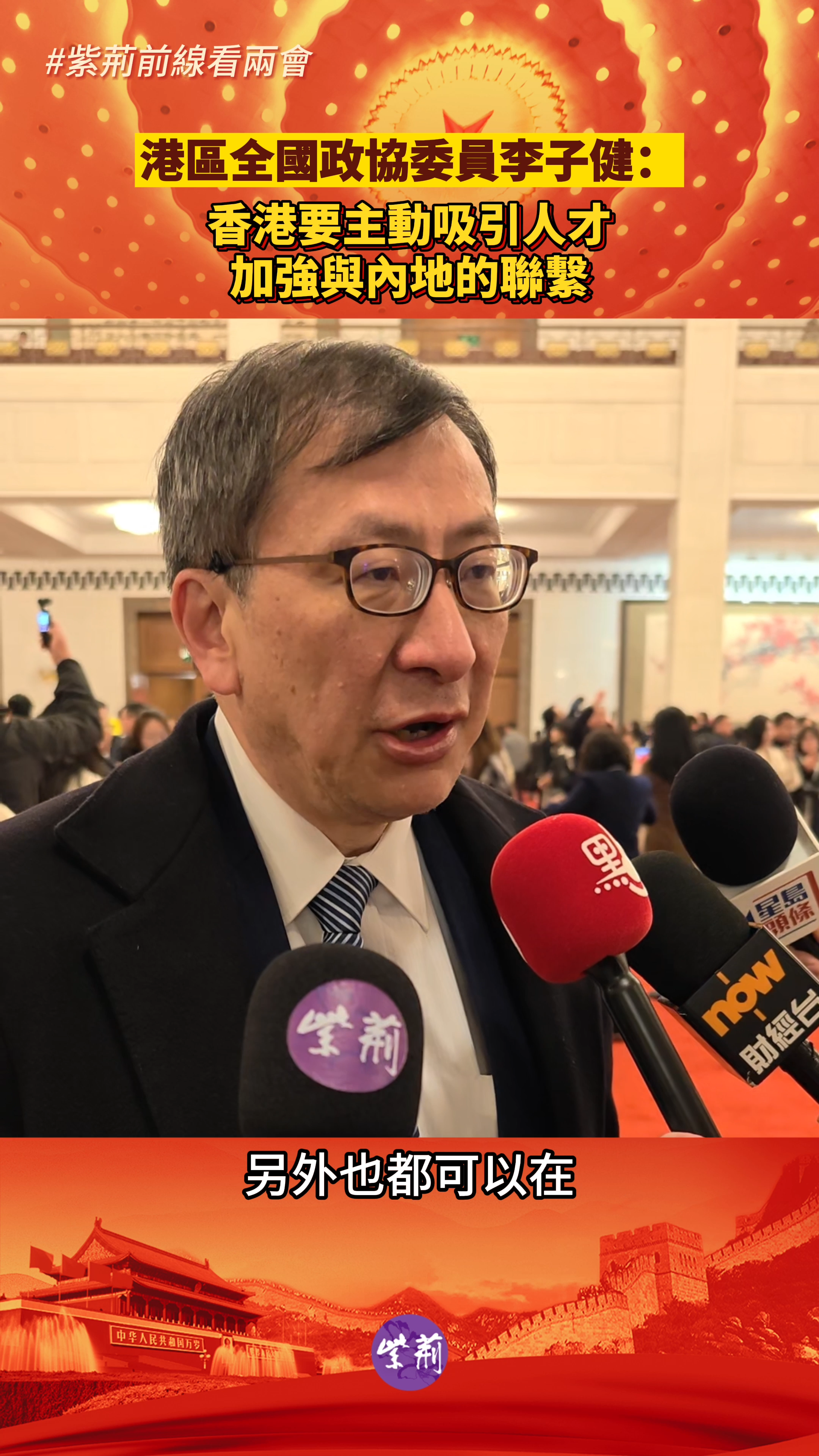 港区全国政协委员李子建在接受紫荆杂志记者采访时表示,香港要吸引人才,加强与内地的联系。#紫荆前线看两会。