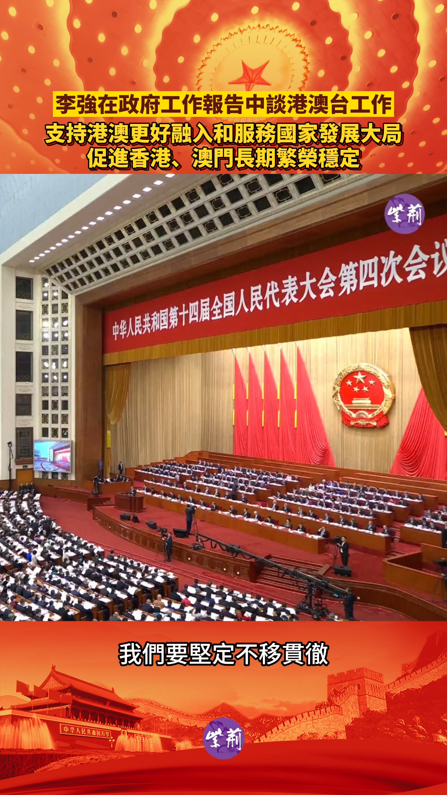 国务院总理李强5日在政府工作报告中表示,我们要坚定不移贯彻“一国两制”、“港人治港”、“澳人治澳”、高度自治方针,落实“爱国者治港”、“爱国者治澳”原则。支持港澳更好融入和服务国家发展大局,促进香港、澳门长期繁荣稳定。