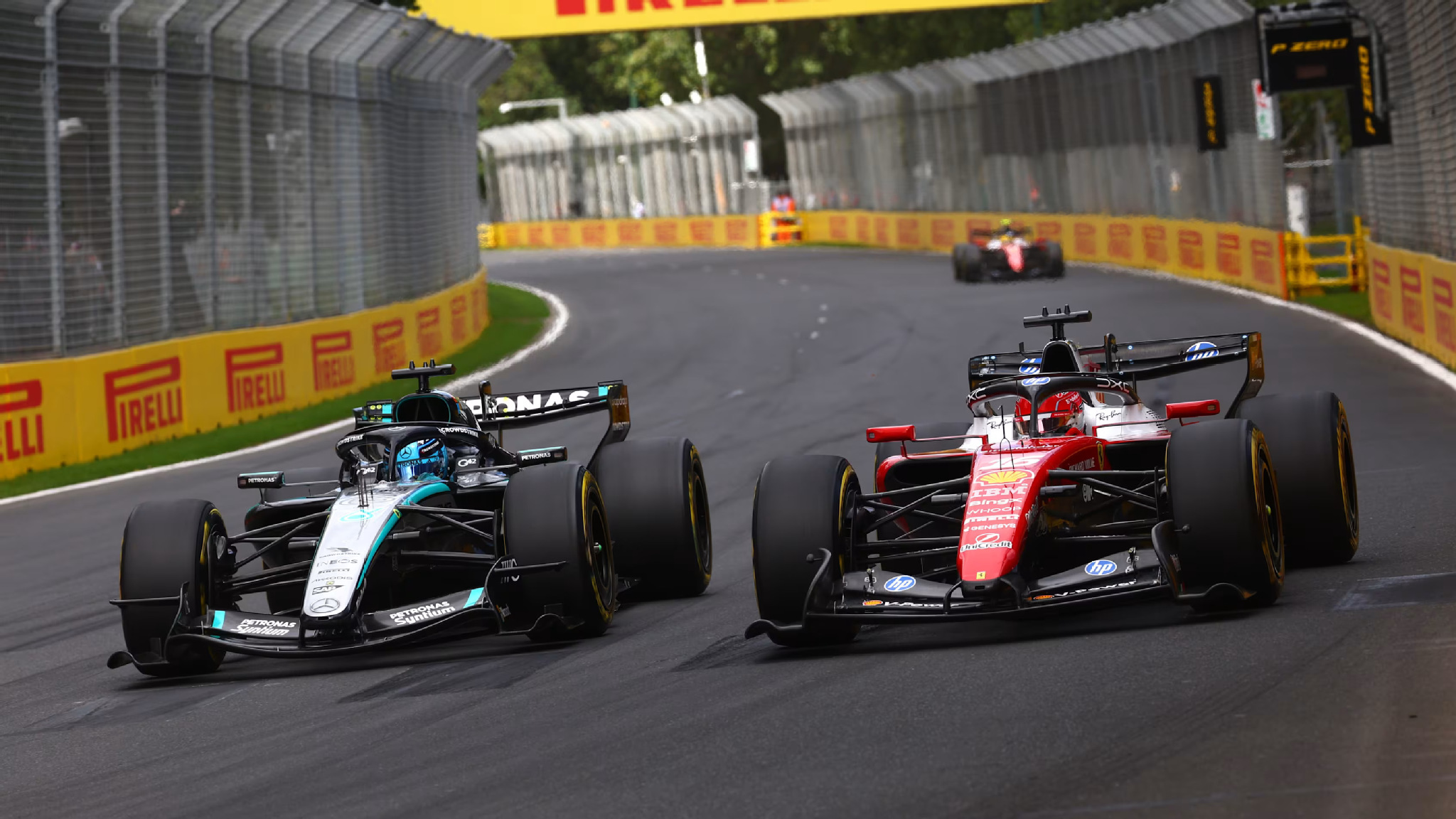 比赛的关键转折出现在第11圈。红牛车队法国新秀艾萨克·哈贾尔的赛车出现故障,被迫停在赛道旁,赛会因此出动虚拟安全车。平治车队把握时机为罗素与安东尼利同时进站换胎,而法拉利则选择继续留在赛道上。之后凯迪拉克车队的华特利·保达斯在维修区入口附近停车,再度触发虚拟安全车,但法拉利仍未选择进站。