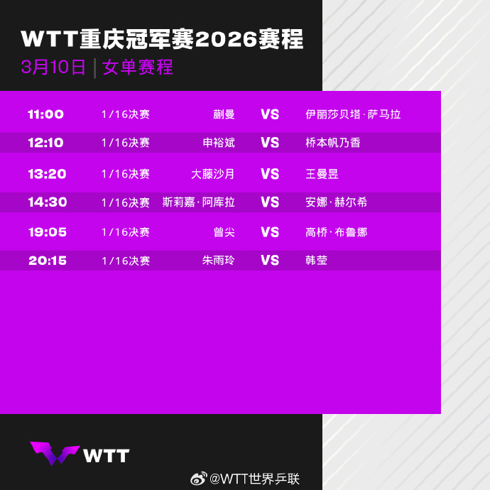 WTT重庆冠军赛2026今日(10日)开锣,国乒选手王曼昱首日出场,第一仗就将迎战强敌日本选手大藤沙月,争入16强。