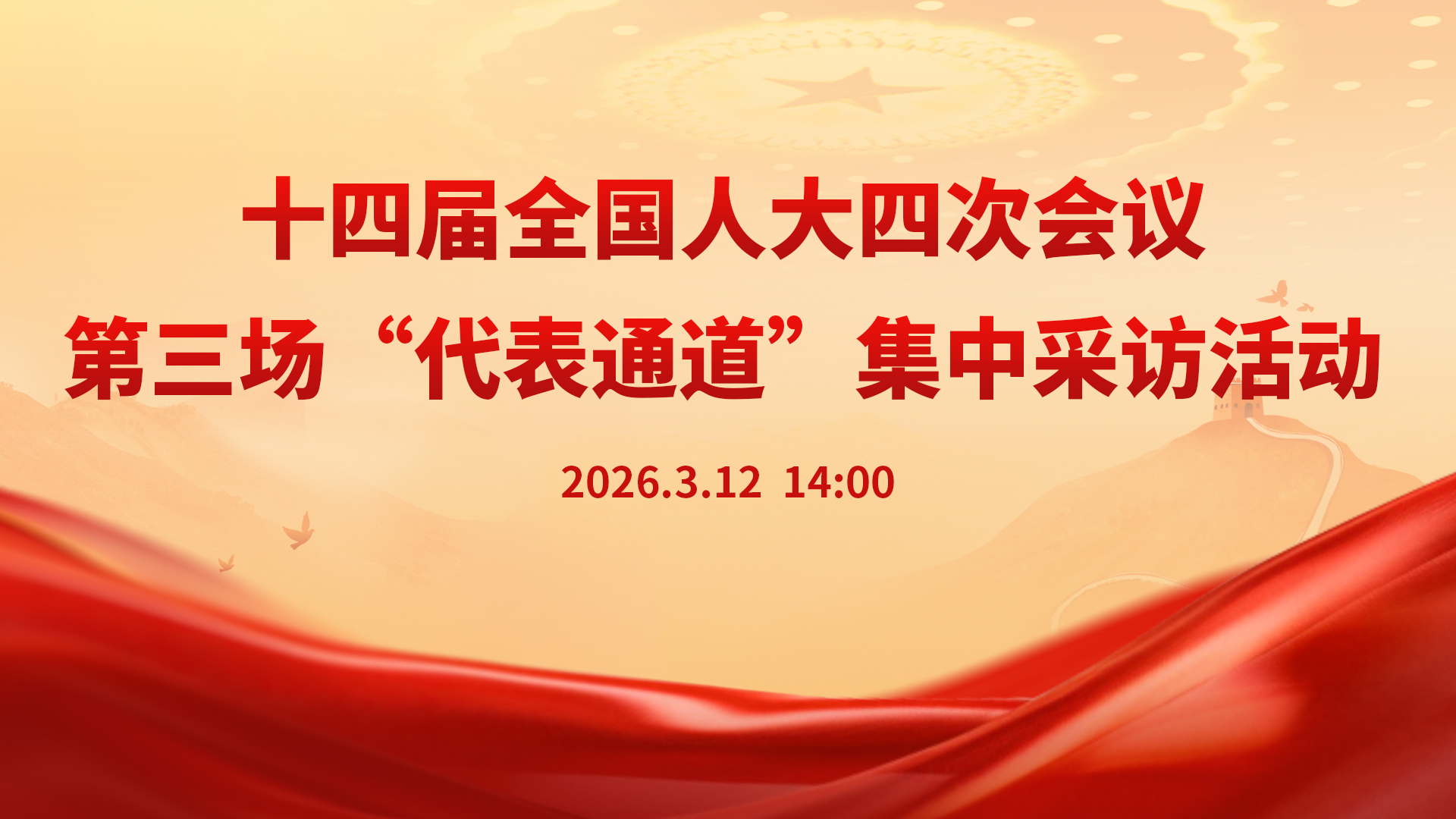 2026年3月12日14:00-14:40,于人民大会堂中央大厅北侧举行十四届全国人大四次会议第三场“代表通道”集中采访活动,部分全国人大代表将接受采访。