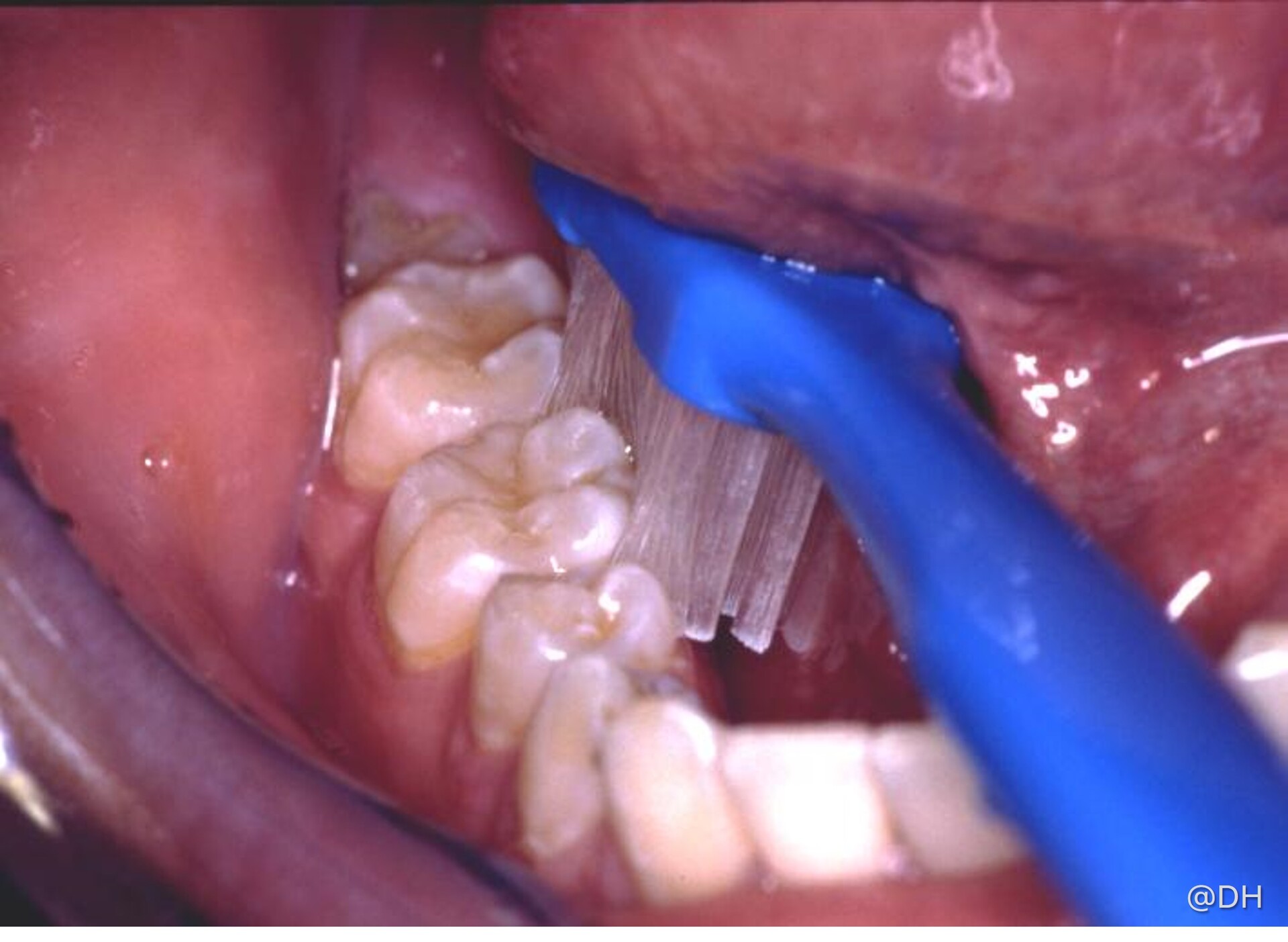 由于牙菌膜容易在牙龈(牙肉)边缘的龈沟内积聚,因此刷牙时需要把牙刷斜放在牙龈边缘。