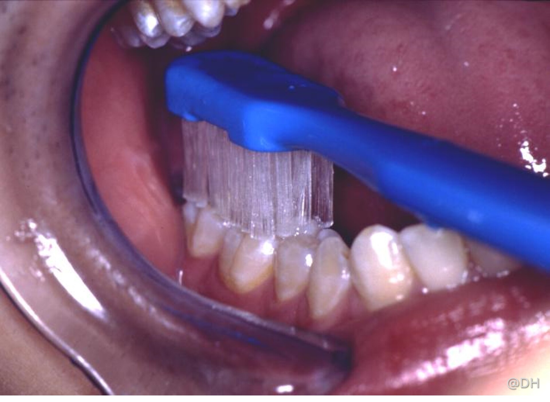 ![]() | 外侧面:从下排牙齿外侧面开始,把牙刷斜放在牙龈边缘,以两至三颗牙齿为一组,用适中力度来回移动牙刷。 |