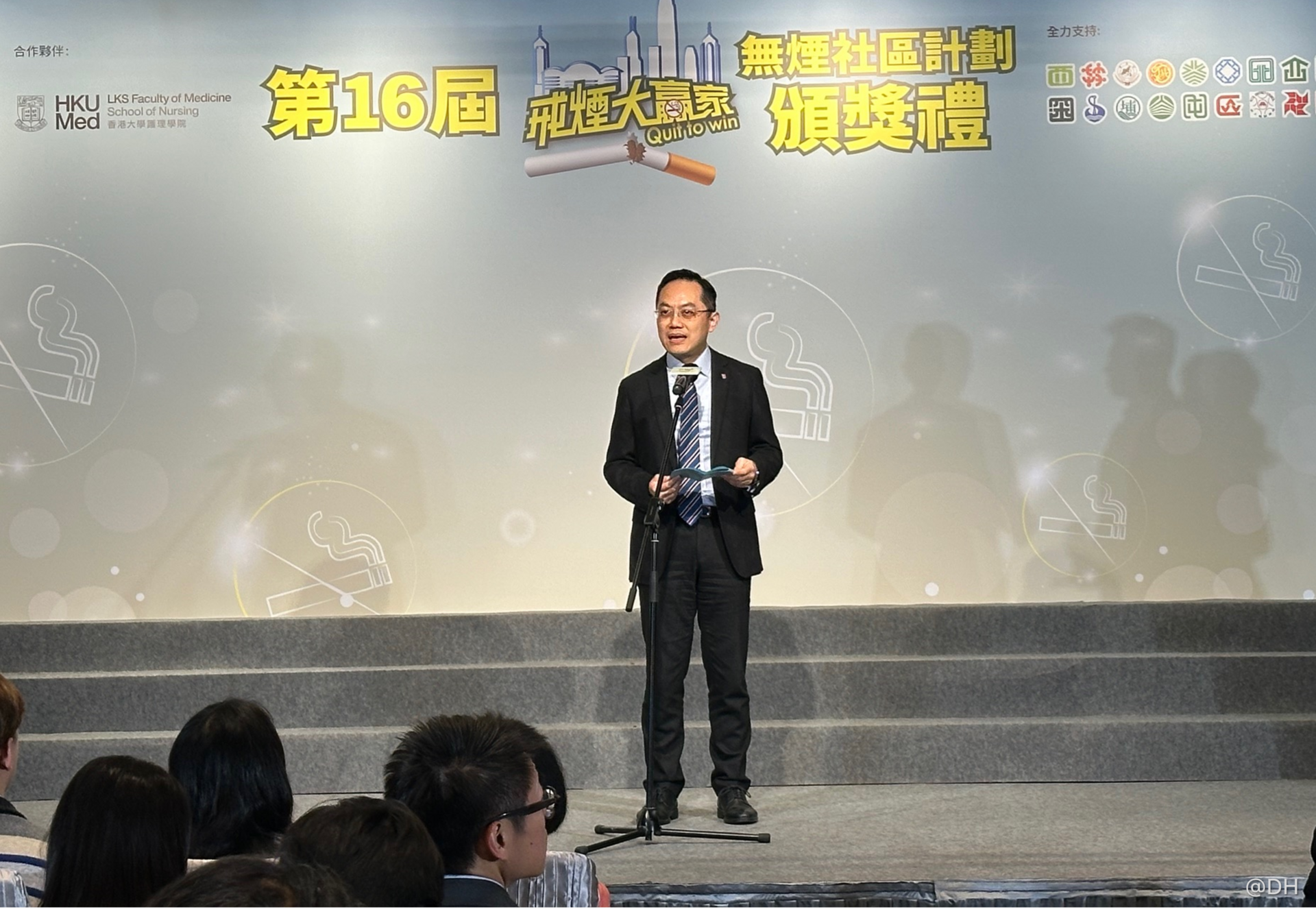 卫生署署长林文健医生三月十二日为香港吸烟与健康委员会主办的“戒烟大赢家”无烟社区计划颁奖礼担任嘉宾,嘉许“戒烟大赢家”比赛的优胜者和成功戒烟的参赛者,同时答谢各个机构支持计划。