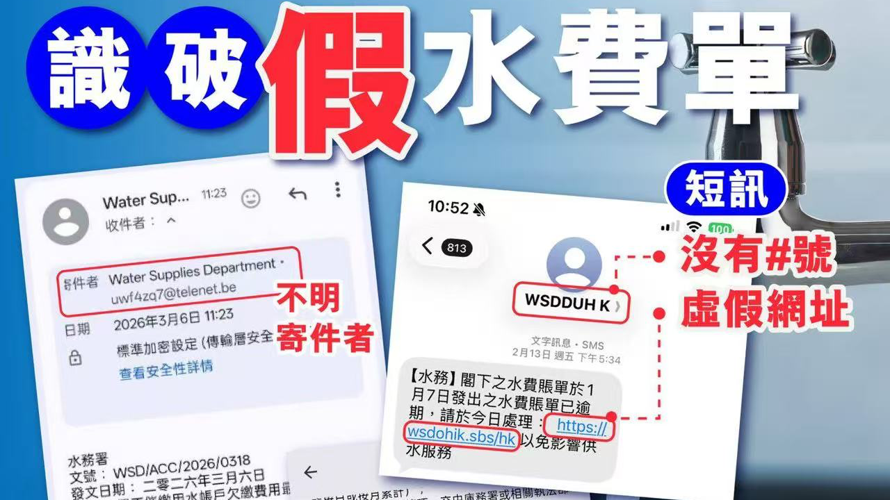 近日,假水费单骗案令多人中招,警方再次提醒市民留意“五大伏位“,只要看清楚发件人名称和网址,便可轻易识破骗局。