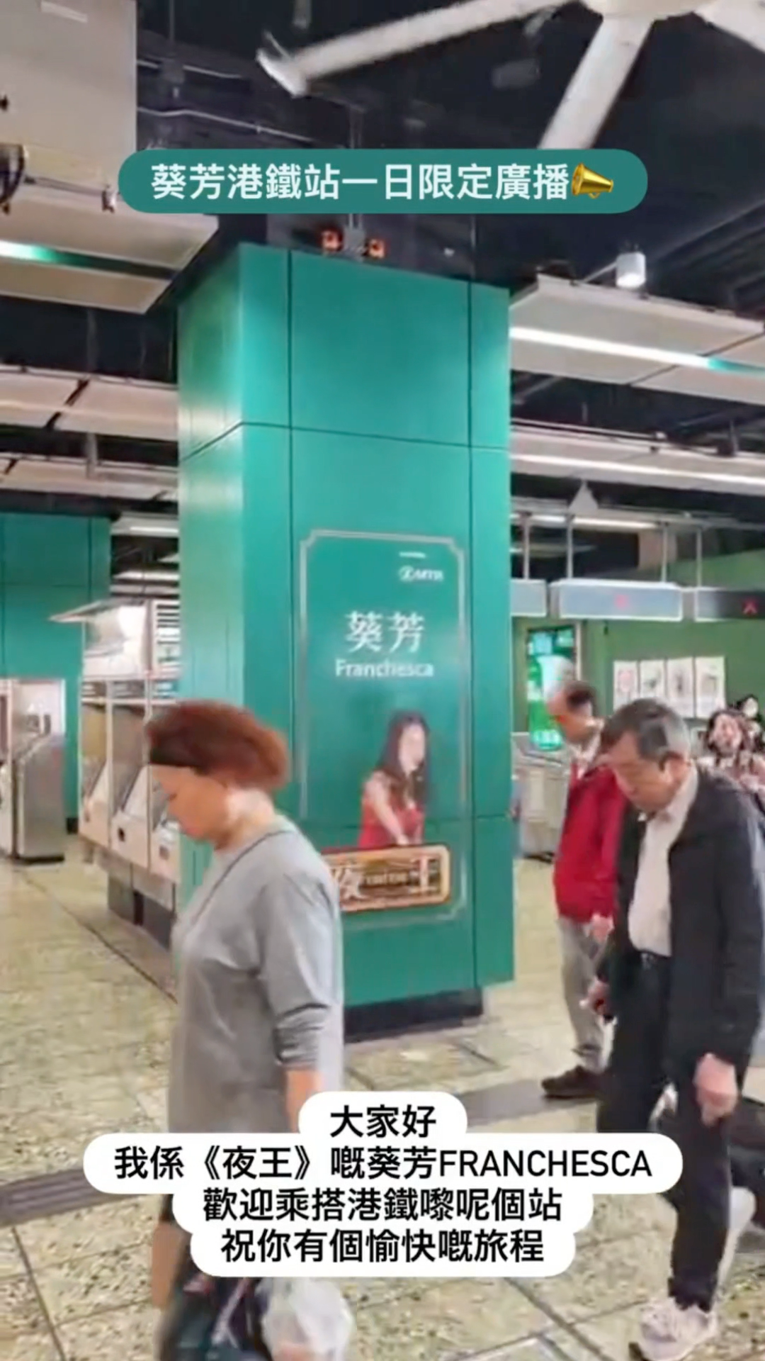 除了视觉上的惊喜,葵芳站13日更有“期间限定广播”。乘客步入车站,便有机会听到蔡蕙琪亲自录制的声带:“大家好,我系《夜王》嘅葵芳Franchesca,欢迎乘搭港铁嚟呢个站,祝你有个愉快嘅旅程。”不少乘客大感惊喜,形容港铁今次创意十足,成功为日常通勤增添电影氛围。