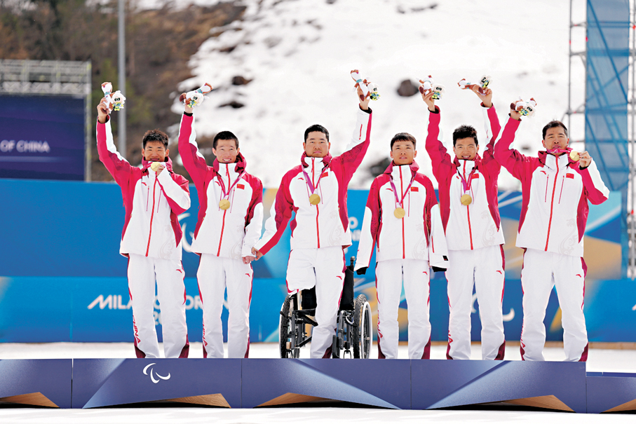 一枚枚沉甸甸的奖牌背后,彰显着我国残疾人运动员自强不息的生命力量,得益于保障团队的有力支撑。一大批业务强、敬业奉献的教练员、领滑员、打蜡师、医疗康复人员、科研人员等为残疾人运动员训练参赛保驾护航,共同托举起冬残奥赛场的高光时刻。“金牌不只属于个人,更属于我们这个光荣的集体。”中国队残奥单板滑雪运动员武中伟说。