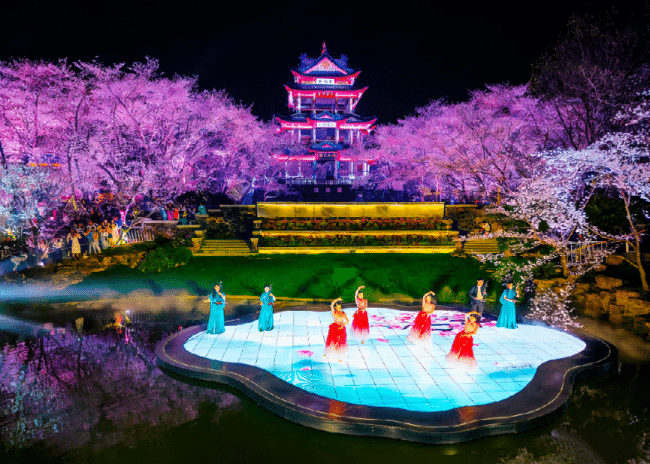 以赏樱楼为核心打造沉浸式夜樱视听体验,大屏光影、环境灯影与人物随身光源三重交织,层次丰富、动静相融,让赏樱者沉浸式置身光影与樱雪交织的春日盛宴。
