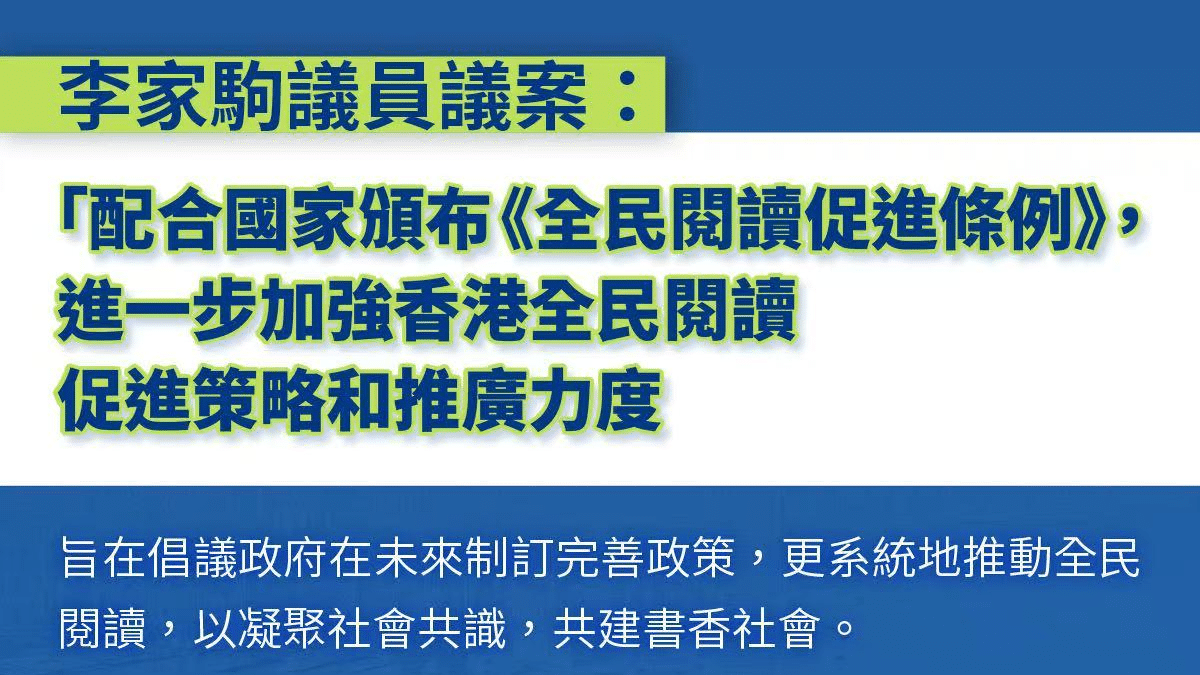 立法会议员李家驹表示,阅读是文化的根基。他将于本周三(3月25日)的立法会大会上,提出其首个议员议案,主题为“配合国家颁布《全民阅读促进条例》,进一步加强香港全民阅读促进策略和推广力度”,旨在进一步推动香港的阅读氛围与文化建设。
