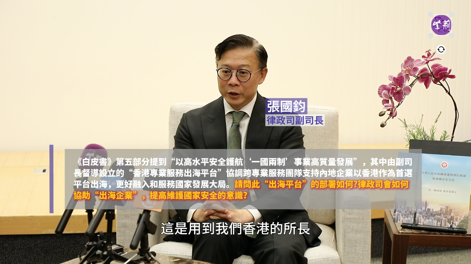 就《白皮书》第五部分提到“以高水平安全护航‘一国两制’事业高质量发展”,其中由副司长督导设立的“香港专业服务出海平台”协调跨专业服务团队支持内地企业以香港作为首选平台出海,更好融入和服务国家发展大局,律政司副司长张国钧回应《紫荆》杂志记者提问时表示,香港专业服务协助内地企业出海,是充分利用香港在专业服务及国际化方面的优势,亦是国家企业当前非常需要的一项服务,是用香港所长、贡献国家所需的一个最好例子。
