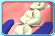 ![]() | 1.把牙线棒左右移动,慢慢把牙线“滑”进牙缝,然后把牙线紧贴一侧牙齿邻面。 |
