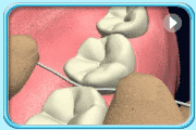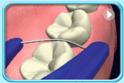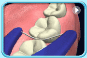 ![]() | 3. 把牙线紧贴牙齿邻面成“C”字形,拉到牙龈沟最深的地方,上下拉动,然后紧贴另一边邻面重复上下拉动的动作。 |
