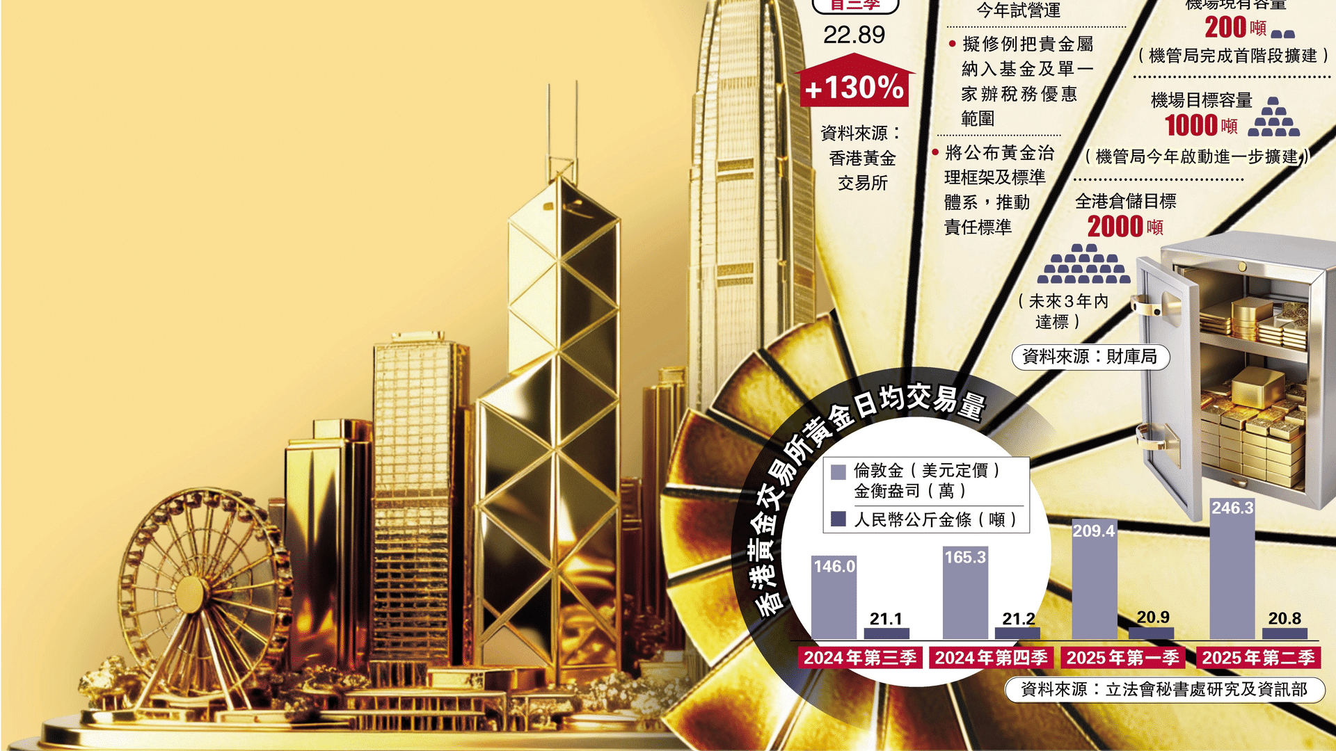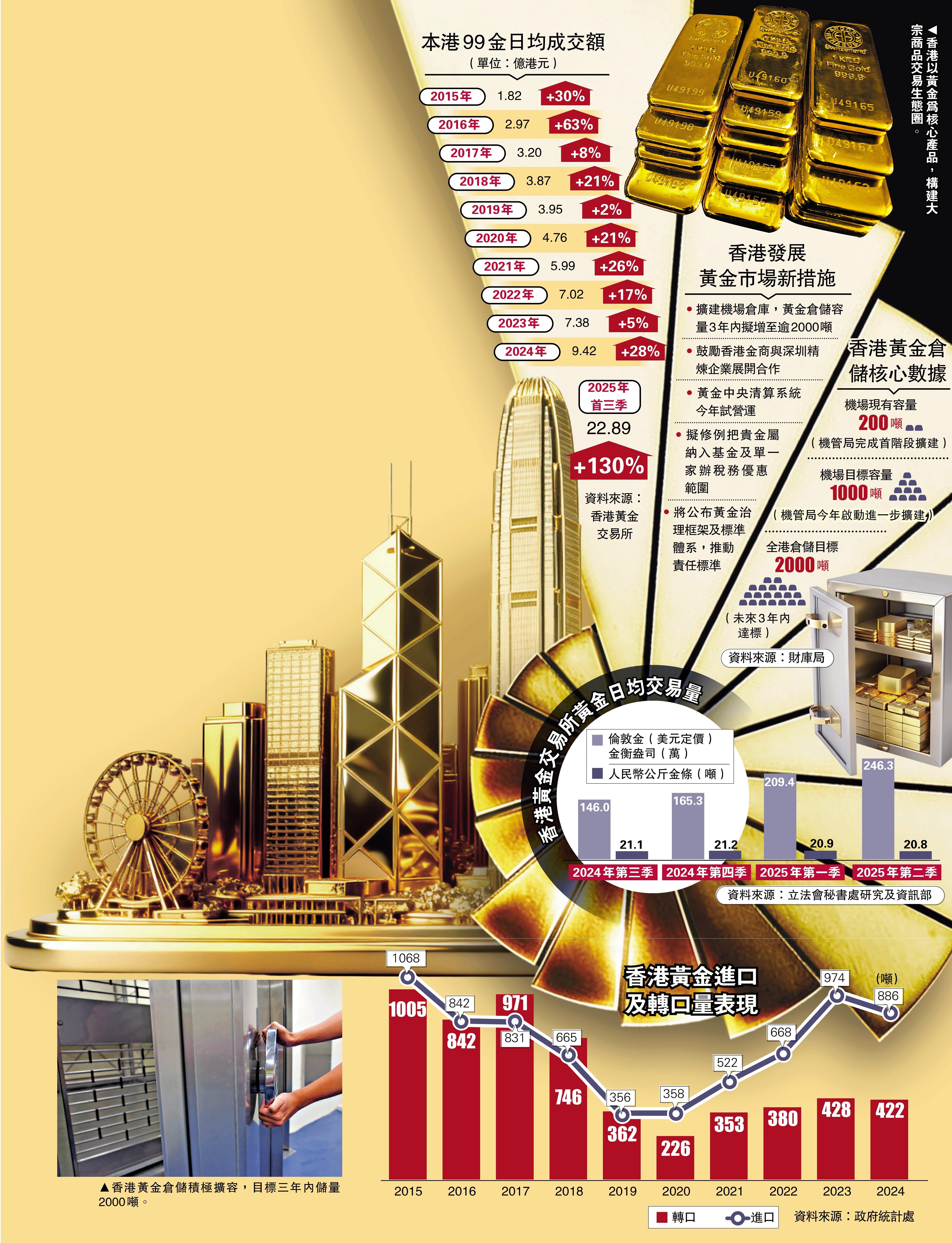 特区政府早在2024年施政报告提出,以黄金为核心产品,推动香港建立大宗商品交易生态圈;2025年施政报告进一步明确,推动香港机场管理局及金融机构扩充黄金仓储容量,力争3年内储量突破2000吨,将香港打造成全球信赖的黄金储备枢纽。