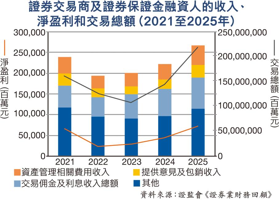 联交所去年平均每日成交额突破新高至2,498亿元,较2024年的1,318亿元增加90%。恒生指数于2025年12月31日收报25,631点,较2024年底的收市水平高28%。市场畅旺亦惠及证券经纪行业,证监会报告显示,去年香港证券经纪行的净盈利急升62%,录得717亿元,创5年新高。证券业的交易总额按年攀升52%至219万亿元,打破2021年创下的前高位。期内,来自证券交易、期货和期权交易、杠杆式外汇交易及虚拟资产交易的净佣金收入,以及利息收入总额按年升16%至755亿元。当中证券交易的净佣金收入急升50%至302亿元,与交易总额的增幅一致,是券商收入大涨的主要动力。