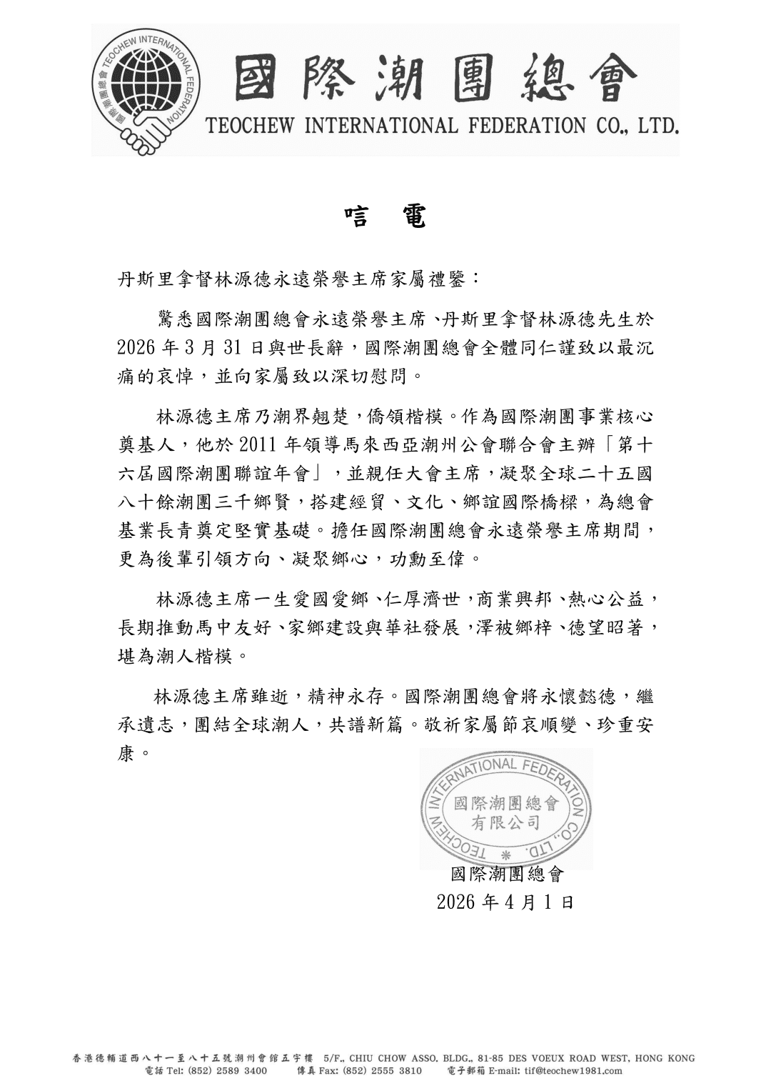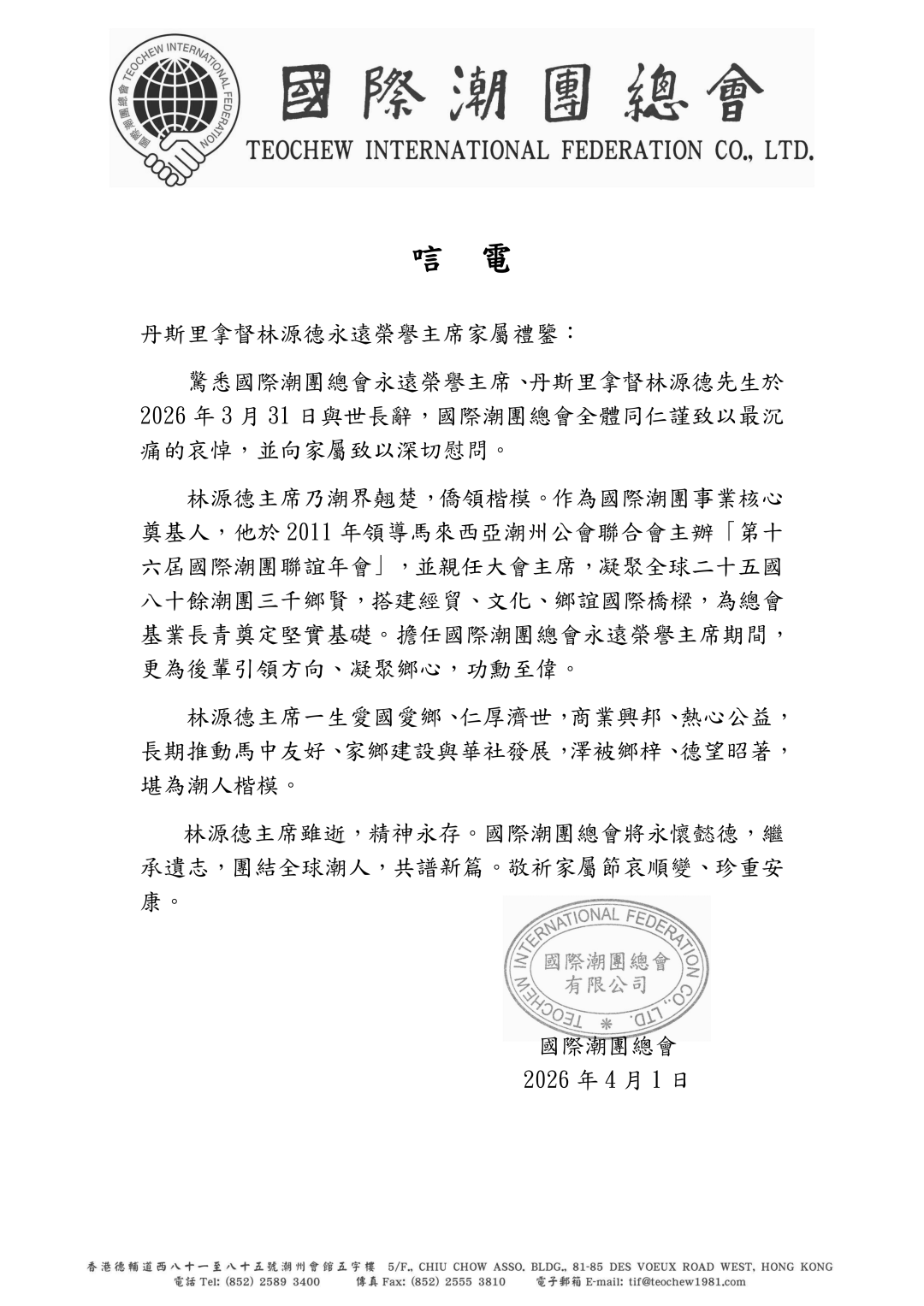 惊悉国际潮团总会永远荣誉主席、丹斯里拿督林源德先生于2026年3月31日与世长辞,国际潮团总会全体同仁谨致以最沉痛的哀悼,并向家属致以深切慰问。