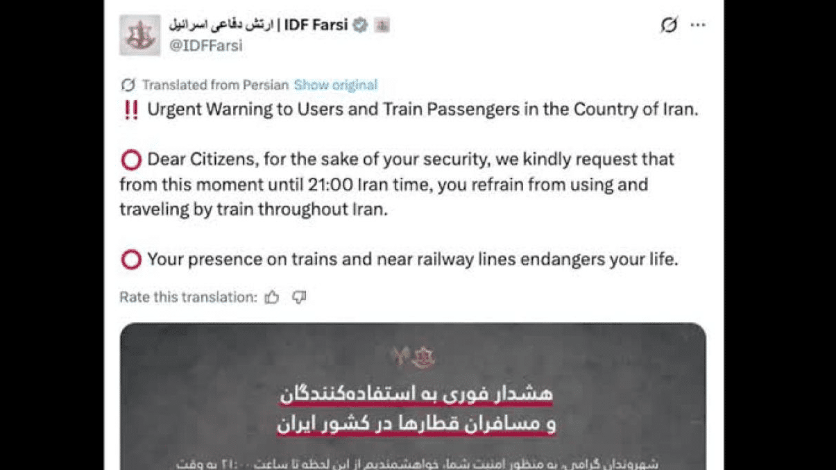 以色列国防军7日在社交媒体用波斯语发表声明,警告伊朗民众不要乘坐火车或靠近铁路。