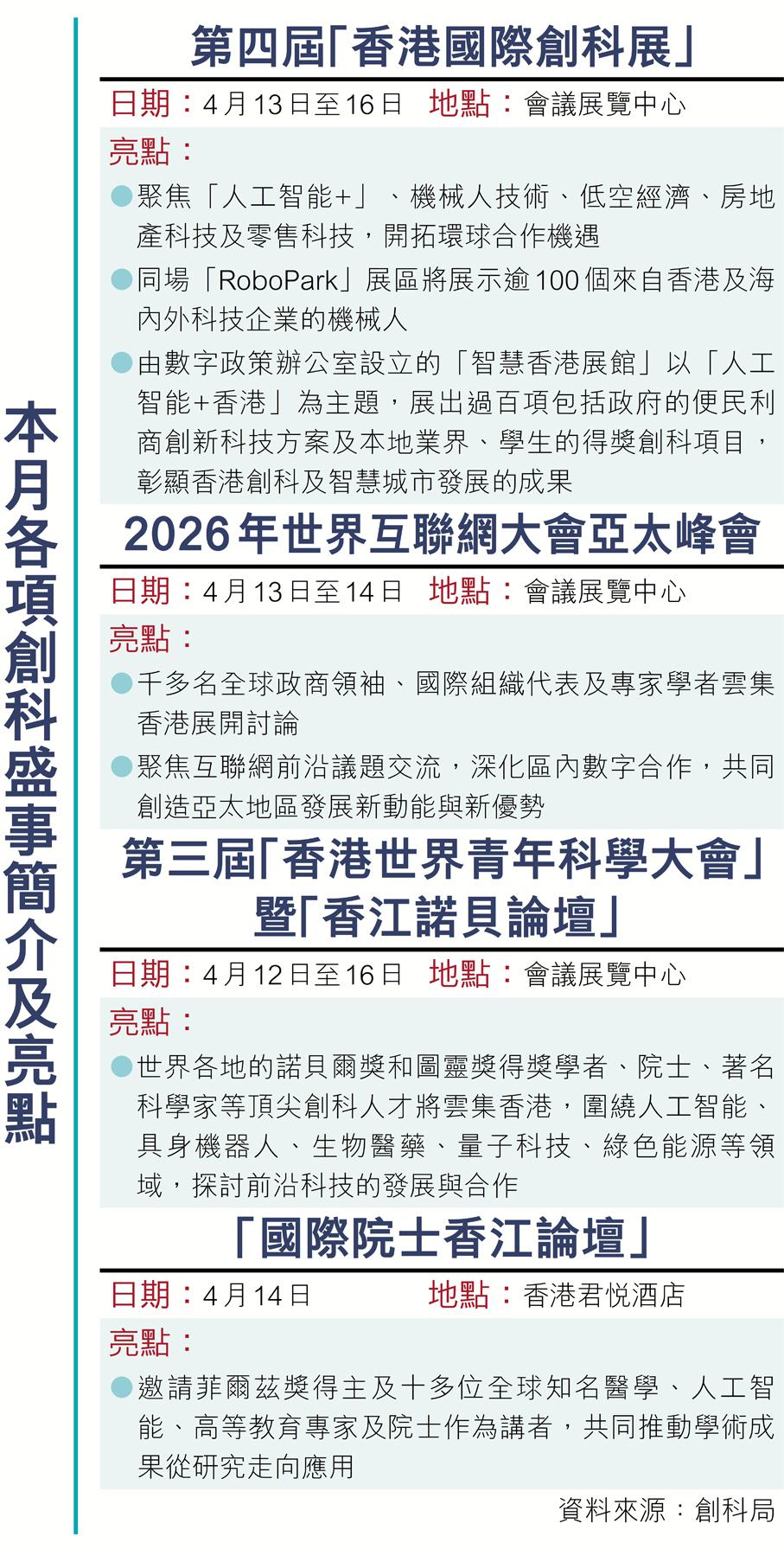 国家“十五五”规划强调要高水平科技自立自强,深入推进数字中国建设,同时要扩大高水平对外开放,巩固提升粤港澳大湾区动力源作用。香港就正以“创科盛事浪接浪”的气势,全力打造香港创科的“金字招牌”:特区政府创新科技及工业局和香港贸易发展局将于本月中举办“国际创科营商周”,届时多项创科盛事,包括旗舰活动“香港国际创科展”(InnoEX)将载誉归来,与“2026年世界互联网大会亚太峰会”同期举行。由香港北京高校校友联盟主办的第三届“香港世界青年科学大会”暨“香江诺贝论坛”更汇聚了世界各地的诺贝尔奖及图灵奖得奖学者、院士等围绕不同领域,探讨前沿科技的发展与合作,充分体现香港在国际科学领域的世界地位。