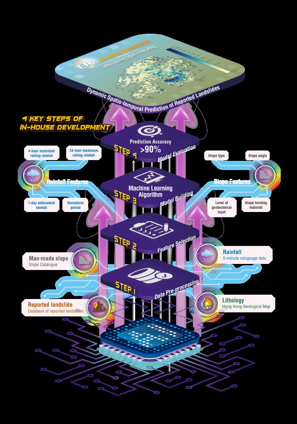 “AI+安全保障”展区展示多项预警与防灾技术。土木工程拓展署自主研发的“人工智能山泥倾泻警告系统”,透过分析实时雨量数据,动态估算山泥倾泻报告数目,预测准确度超过九成。系统已于去年成功试行,将于今年全面应用,优化山泥倾泻警告发放。