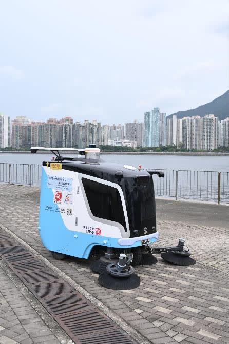 食物环境卫生署展出自去年6月起于沙田马料水海滨行人道试行的“自动清扫机械人”。机械人配备光学雷达、超声波感测器及相机,能自动检测及避开障碍物,并发出声光警报提醒途人,有助提升工作效率及减轻前线员工体力消耗。