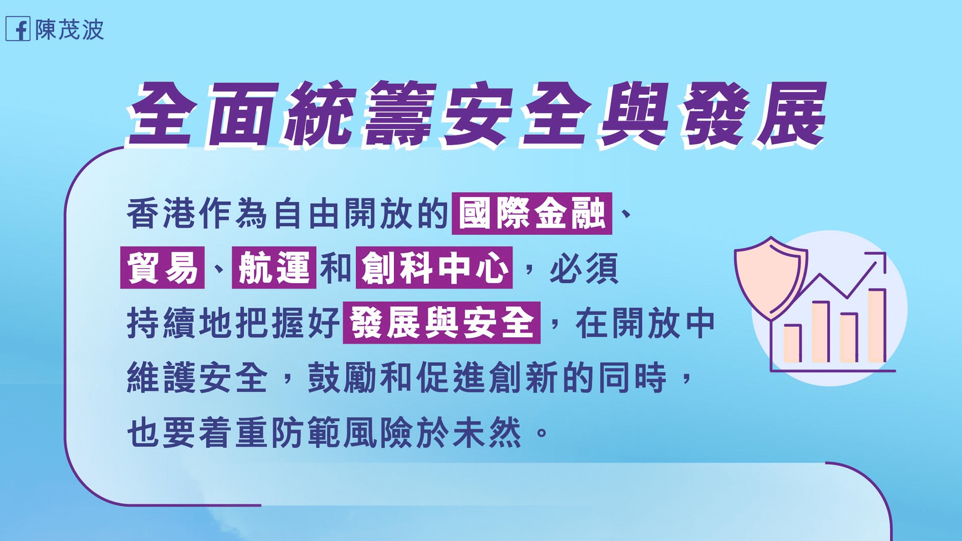 “十五五”规划纲要将“统筹发展和安全”确立为六个推动“十五五”时期经济社会发展必须遵循的原则之一。今年二月公布的《“一国两制”下香港维护国家安全的实践》白皮书,提出维护国家安全的“六个坚持”,当中亦包括“坚持统筹发展与安全”。事实上,香港作为自由开放的国际金融、贸易、航运和创科中心,必须持续地把握好发展与安全,在开放中维护安全,在巩固和提升自身优势、鼓励和促进创新的同时,也要着重防范风险于未然。
