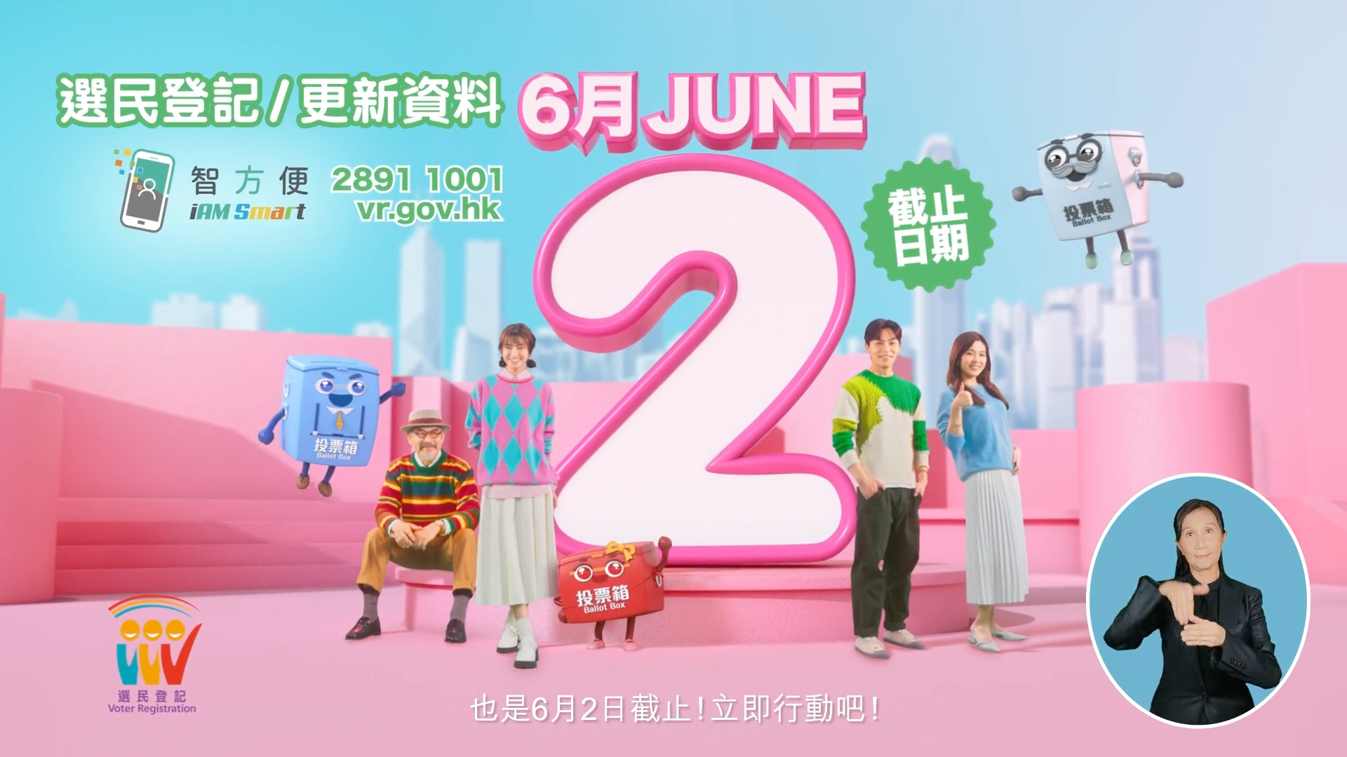 选民登记运动的政府宣传短片和声带今日起在不同媒体和地点播放。此外,宣传内容亦会透过网站、流动应用程式、各区海报/横额以及公共运输系统如巴士及电车车身、港铁站和巴士站展示。今年的选民登记运动将继续沿用广受市民欢迎的“票箱家族”——“蓝小宝”“红小宝”和“白爷爷”作宣传,鼓励市民踊跃登记。