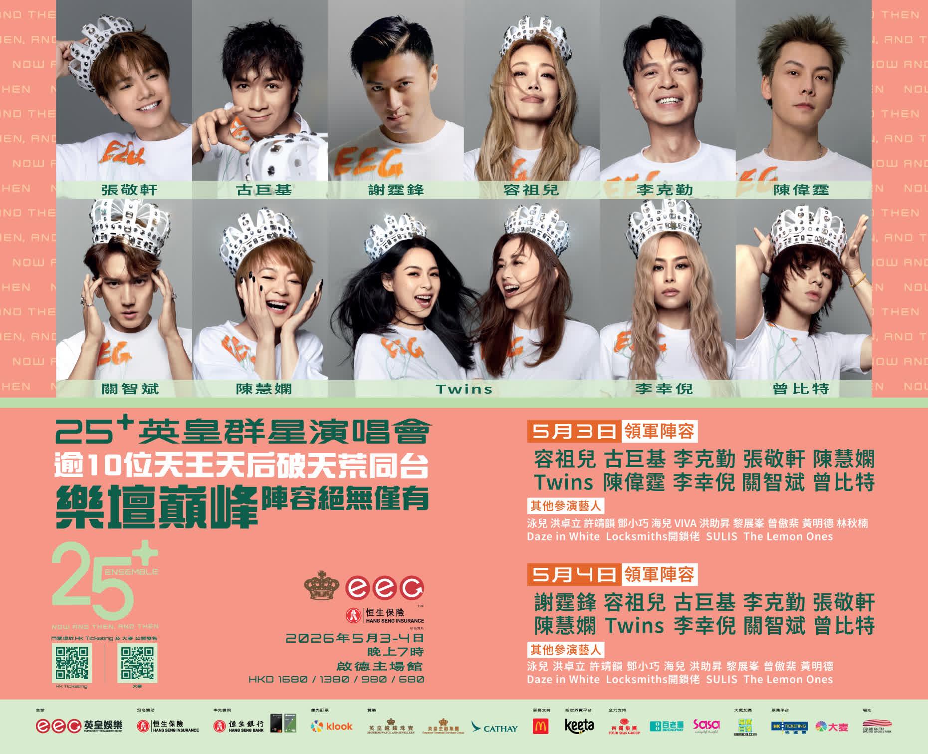 由英皇娱乐主办、恒生保险冠名赞助,英皇钟表珠宝、英皇金融、Keeta 及国泰联合呈献的【恒生保险呈献:25+英皇群星演唱会】继早前宣布5月4日表演艺人名单后,大会正式公布5 月3日场次阵容,包括容祖儿、古巨基、李克勤、张敬轩、陈慧娴、Twins、陈伟霆、李幸倪、关智斌、曾比特等。超过十位乐坛天王天后首次同台启德,阵容强劲绝无仅有。