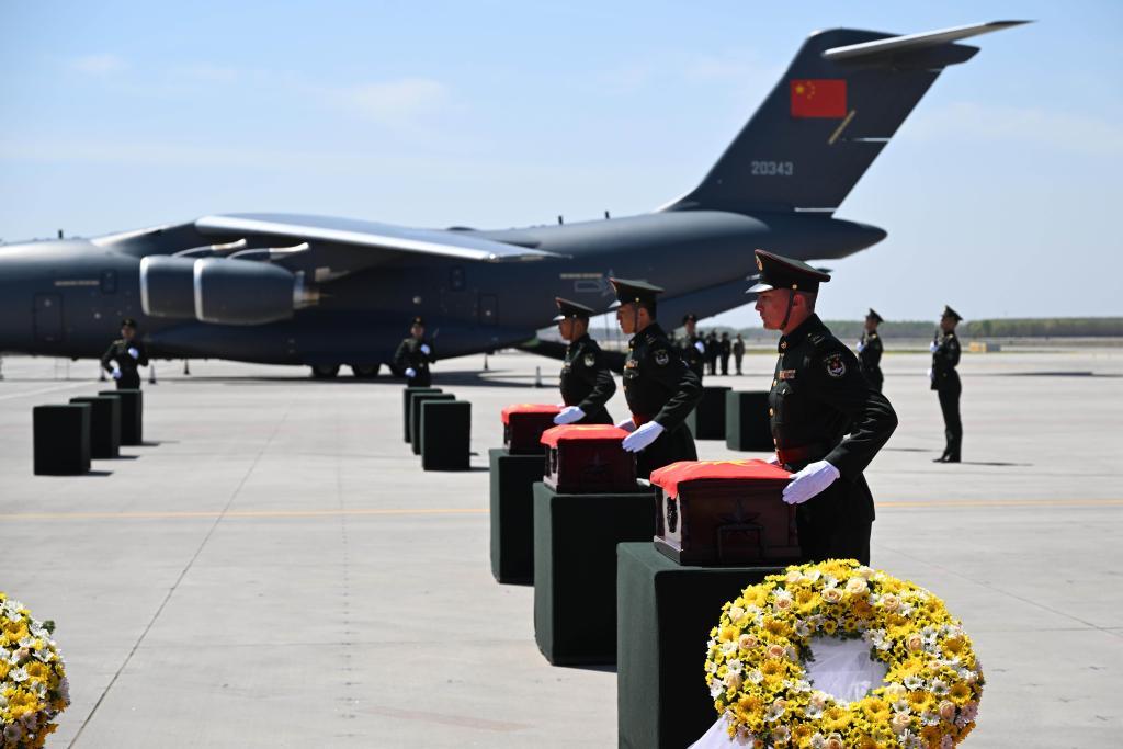 4月23日上午,在沈阳抗美援朝烈士陵园举行第十三批在韩中国人民志愿军烈士遗骸安葬仪式。