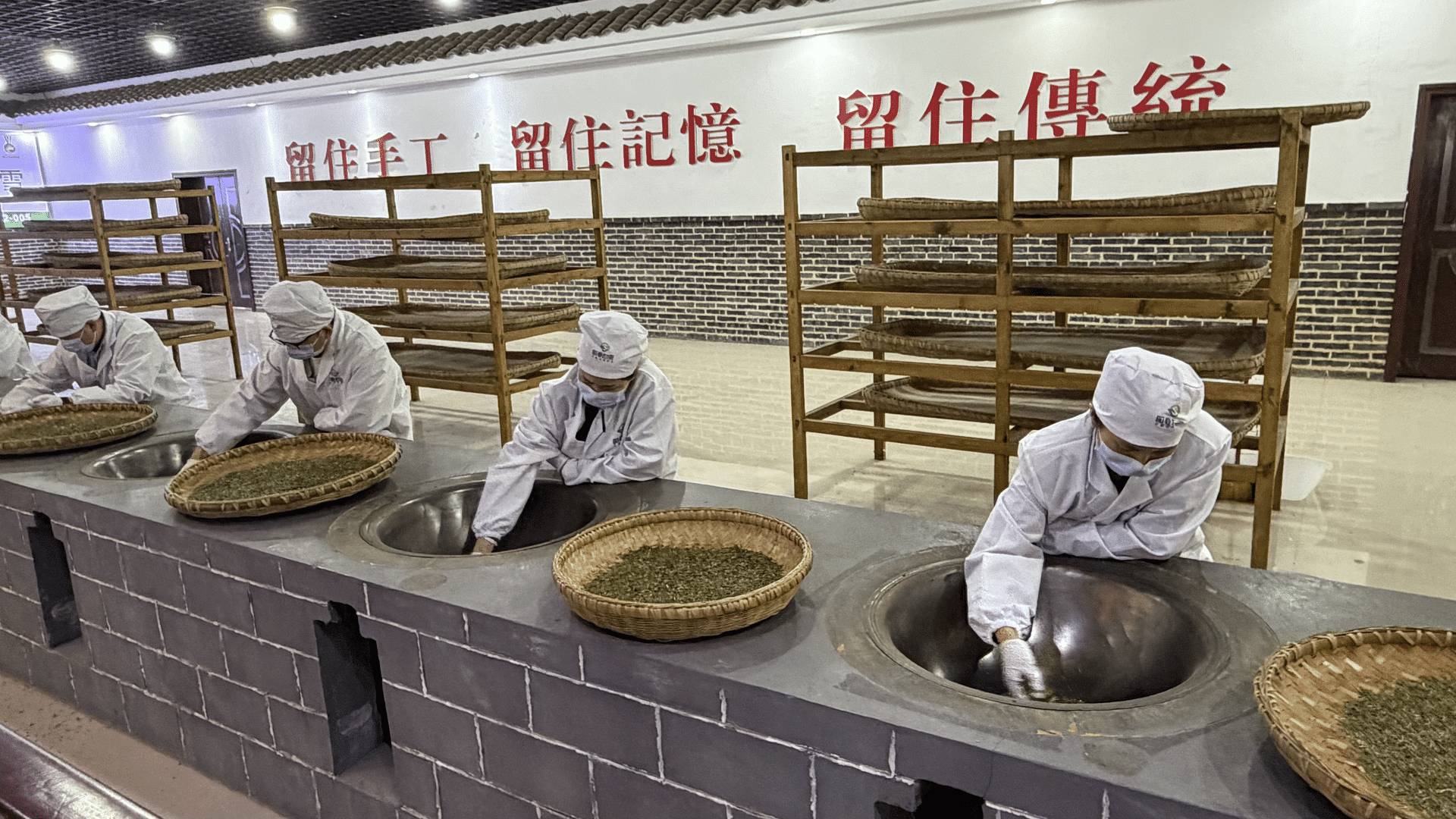 贵州阳春白雪茶业公司内,国茶人物·制茶大师唐诗江正徒手在200多度的铁锅中快速翻炒,茶香弥漫整个空间。他是贵州湄潭翠芽茶叶制作技艺的第十代传承人,长年累月的高温炒制,让他的指纹几乎被磨平,双手布满厚茧,但他依然坚持手工制茶。“从鲜叶到乾茶,一锅手工茶需要两个小时。”唐师傅十分热爱自己的事业,他说,自己从18岁开始做茶,决心要做到81岁再退休。