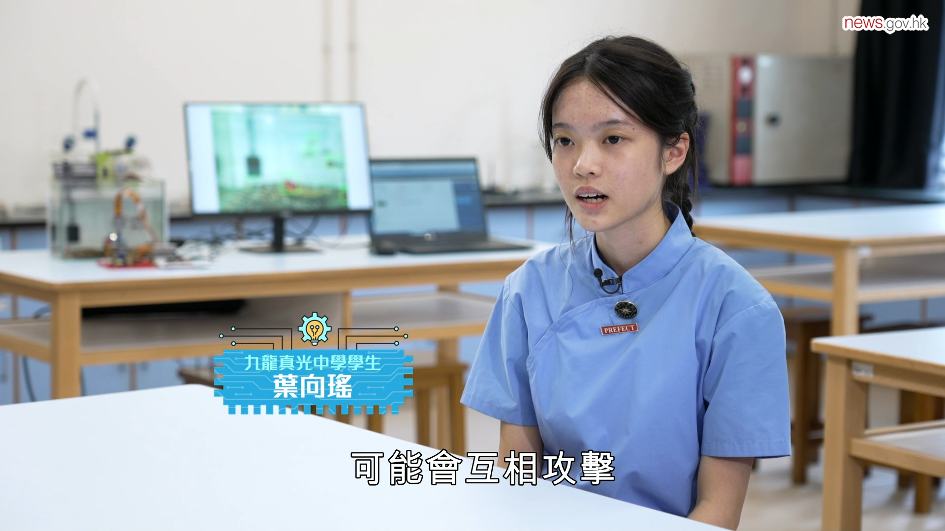 中四学生叶向瑶谈及的是九龙真光中学人工智能鱼类辨认及生态环境监测课程的内容。她自幼热爱鱼类生态,去年得知学校开办该课程,立即报名参加。