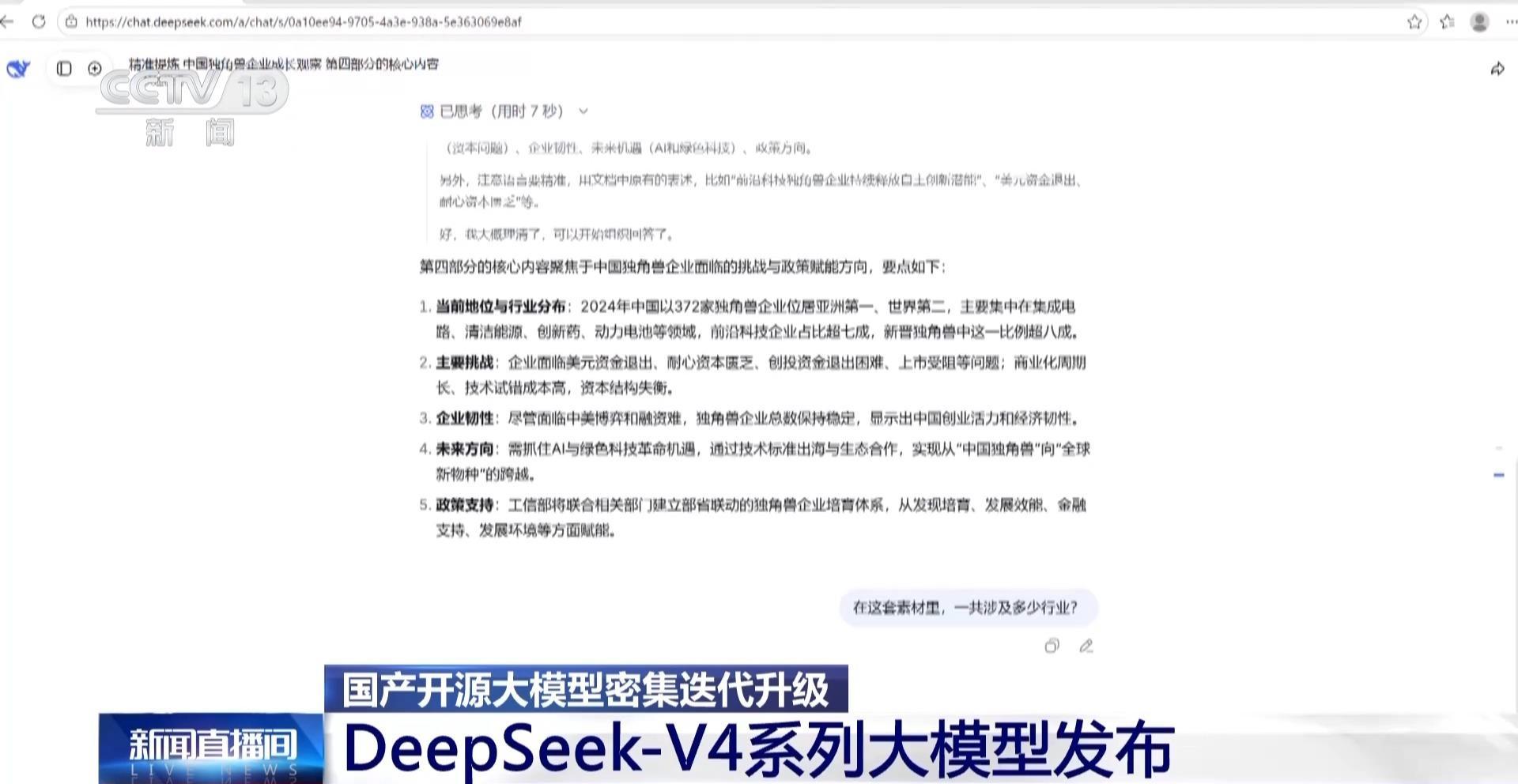 随后,记者提出了需要横跨全部近百万字内容才能回答的问题:“在这套素材里,一共涉及多少行业?”大模型给出了共涉及约45个细分行业的答复。