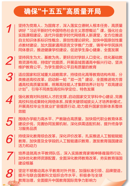 八是坚定不移推动高水平教育对外开放,加强标准引领、品牌塑造,提升与联合国教科文组织合作水平,积极参与全球教育治理,全面提升中国教育国际竞争力影响力。