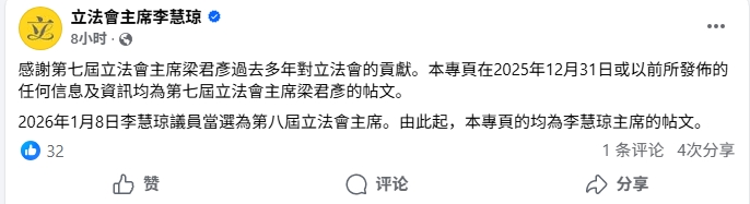 立法会主席Facebook主页名字更新,由梁君彦改为李慧琼。帖文表示,2026年1月8日李慧琼议员当选为第八届立法会主席。由此起,该专页的均为李慧琼主席的帖文。
