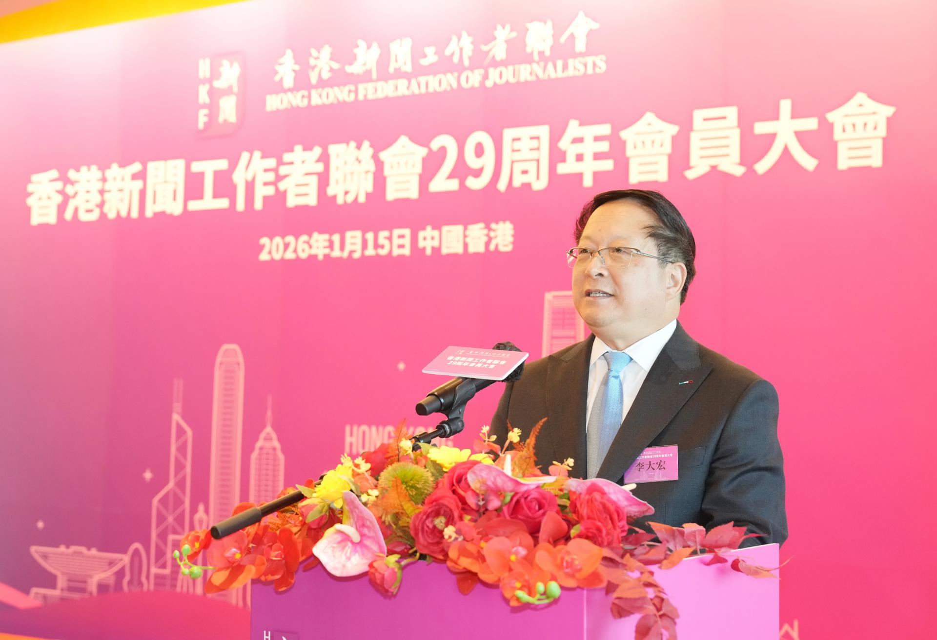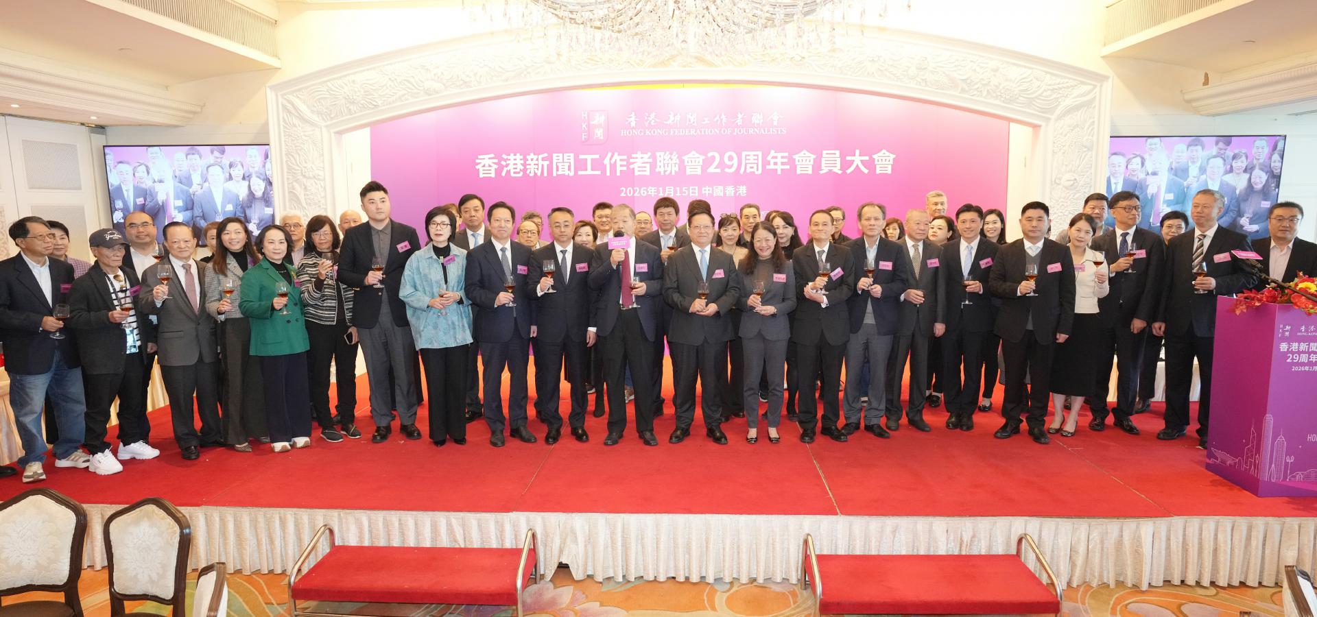 1月15日,香港新闻工作者联会(简称“新闻联”)成立29周年会员大会隆重举行。新闻联主席李大宏、会长张国良率理事会成员,与逾400名会员代表欢聚一堂。大会邀得政府新闻处处长廖李可期、中央政府驻港联络办宣传文体部副部长李曙光、行政长官办公室新闻统筹专员谢振中担任主礼嘉宾。与会嘉宾及会员共同回顾过去一年的耕耘与收获,共商新阶段业界团结发展之大计。