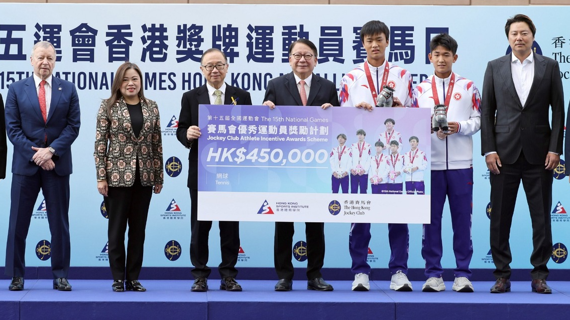 香港赛马会今天(1月18日)举办“十五运会香港奖牌运动员赛马日”,表扬港队在首次由粤港澳三地共同承办的第十五届全国运动会(十五运会)中,勇夺九金、两银及八铜,创下本港于全运会的历史佳绩。赛马日同场进行“赛马会优秀运动员奖励计划”支票颁赠仪式,向奖牌健儿发放奖金11,475,000港元。